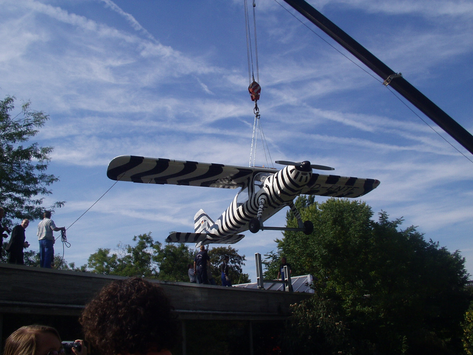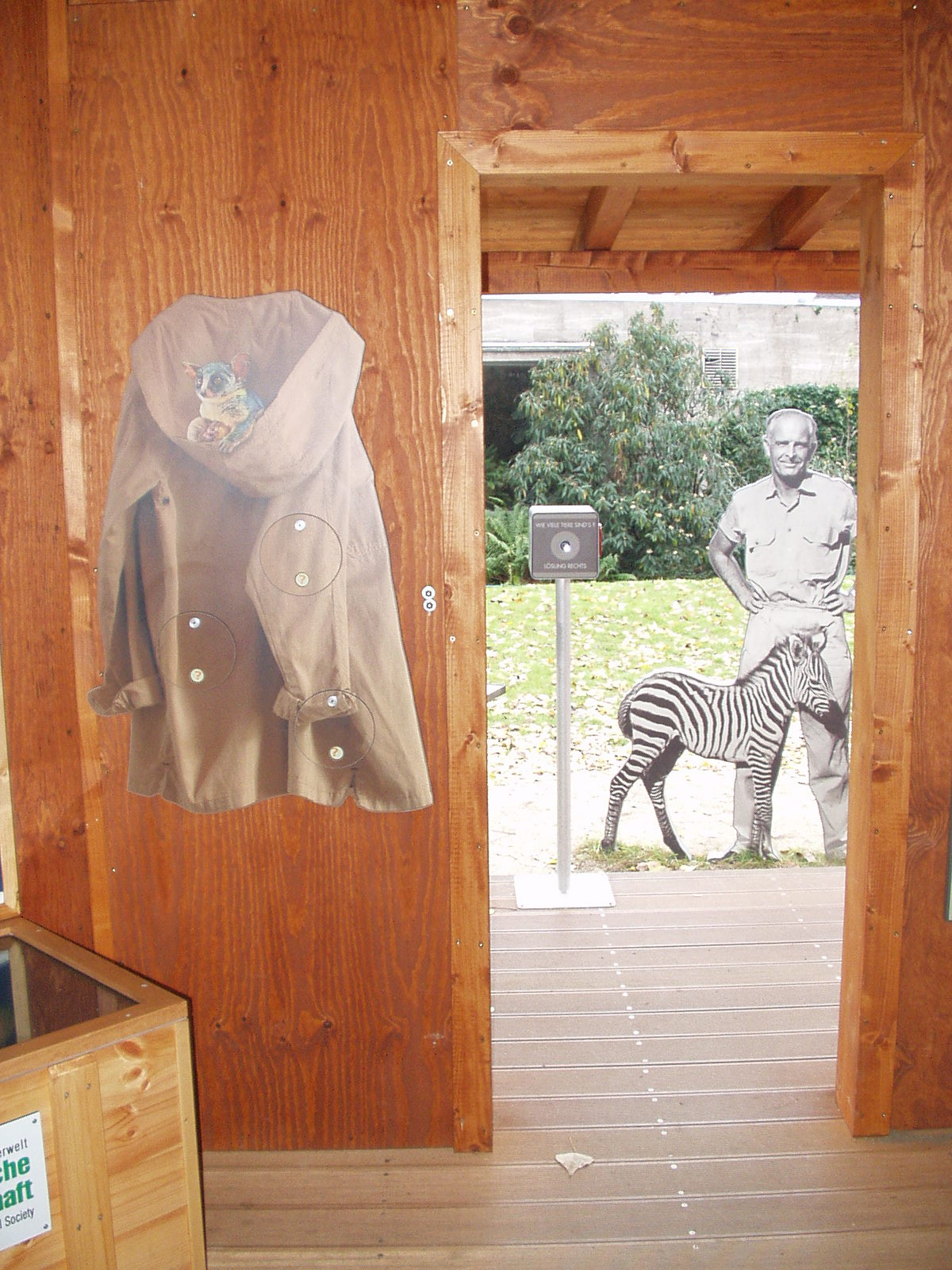 Die Person Bernhard Grzimeks und seine Verdienste für den Naturschutz sollen anhand einer inszenatorischen Dauerausstellung im Außenbereich (wieder) ins Bewusstsein gebracht werden. Ein Flugzeug gleichen Typs (DO 27), mit dem Grzimek und sein Sohn seinerzeit nach Afrika geflogen sind und ein Landrover, beide mit original Zebrastreifen lackiert, sowie eine zeltartige Hütte im afrikanischen Stil, bilden die zentralen Elemente für die Nachempfindung einer Camp-Situation in der Serengeti. Informationen über die wegweisenden Naturschutzaktivitäten vor allem in Ostafrika, Grzimeks visionäres Engagement für die Zoologische Gesellschaft Frankfurt sowie seine Verdienste für den Wiederaufbau des Frankfurter Zoos werden in erster Linie über Bilder, interaktive Elemente und Hörstationen vermittelt. Eine besondere Herausforderung bestand darin, das Flugzeug auf das Dach des Affenhauses zu heben und dort zu montieren.