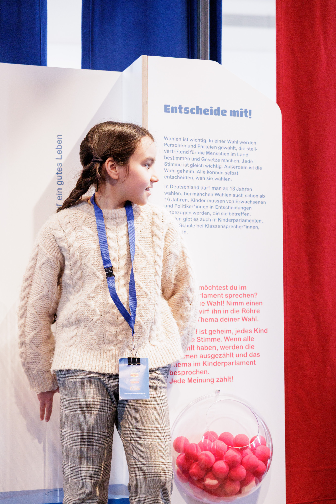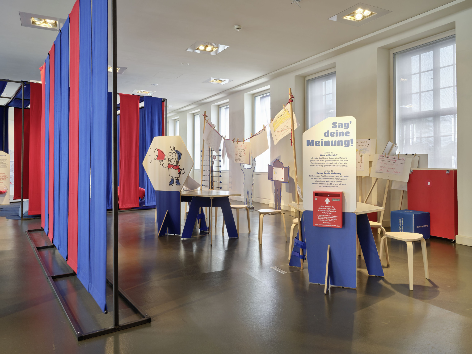 Die interaktive Ausstellung zu den Kinderrechten wurde im Auftrag des Kinderbüros zunächst als Wanderausstellung konzipiert und gestaltet. Die Stationen bestehen aus mobilen Elementen, die sich innerhalb eines halben Tages auf- oder abbauen lassen. Für eine Präsentation im Jungen Museum wurde die Ausstellung um ein Forum sowie durch weitere Stationen erweitert. Um die Raumakustik zu verbessern und die inhaltlichen Stationen zu struktieren, wurden Raumtrenner mit Textilbahnen eingebracht.