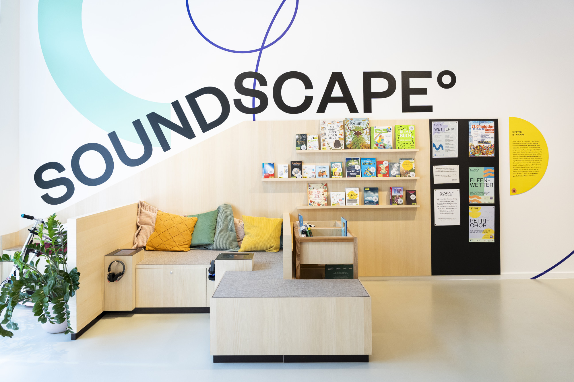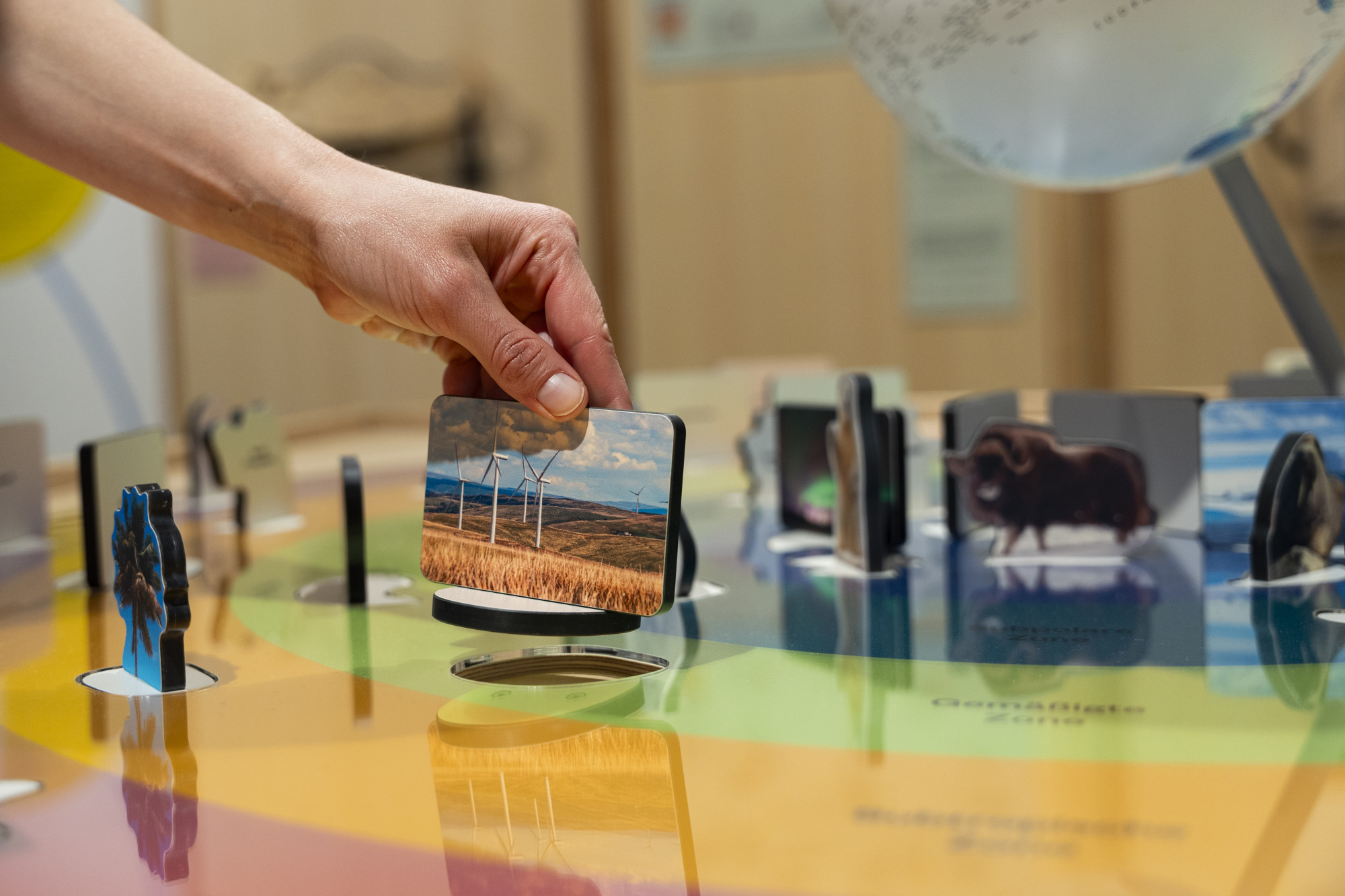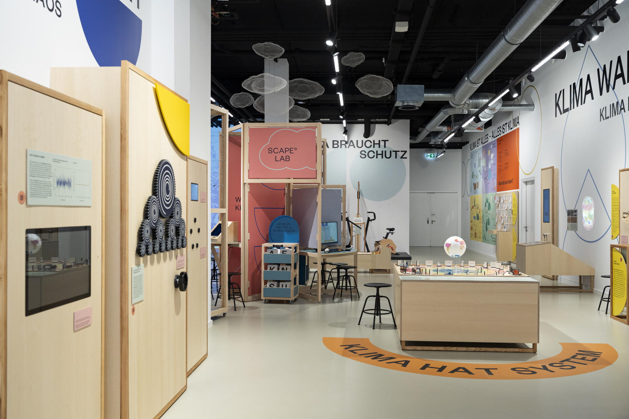 Die Ausstellungsarchitektur arbeitet mit hellen Holzelementen als Basis, die Farbigkeit wird durch die Exponate eingebracht sowie auch über die expressive grafische Gestaltung und schafft so eine freundliche, einladende Atmosphäre.