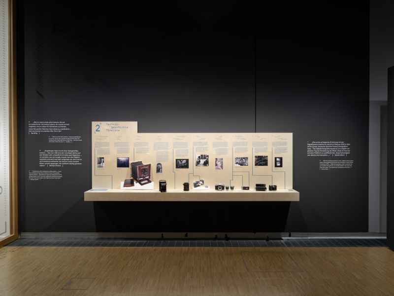 Für die Präsentation von rund 450 Exponaten wurde eine Architektur entwickelt, die sowohl kabinettartige Räume als auch lange Blickachsen nutzt, um eine abwechslungsreiche Dramaturgie zu schaffen. Diese Struktur unterstützt die chronologisch angeordneten Themenschwerpunkte und den vielfältigen Exponatbestand. Das Farbkonzept orientiert sich am Graukeil aus der Schwarz-Weiß-Fotografie und hilft dabei, die verschiedenen Bereiche visuell zu gliedern.