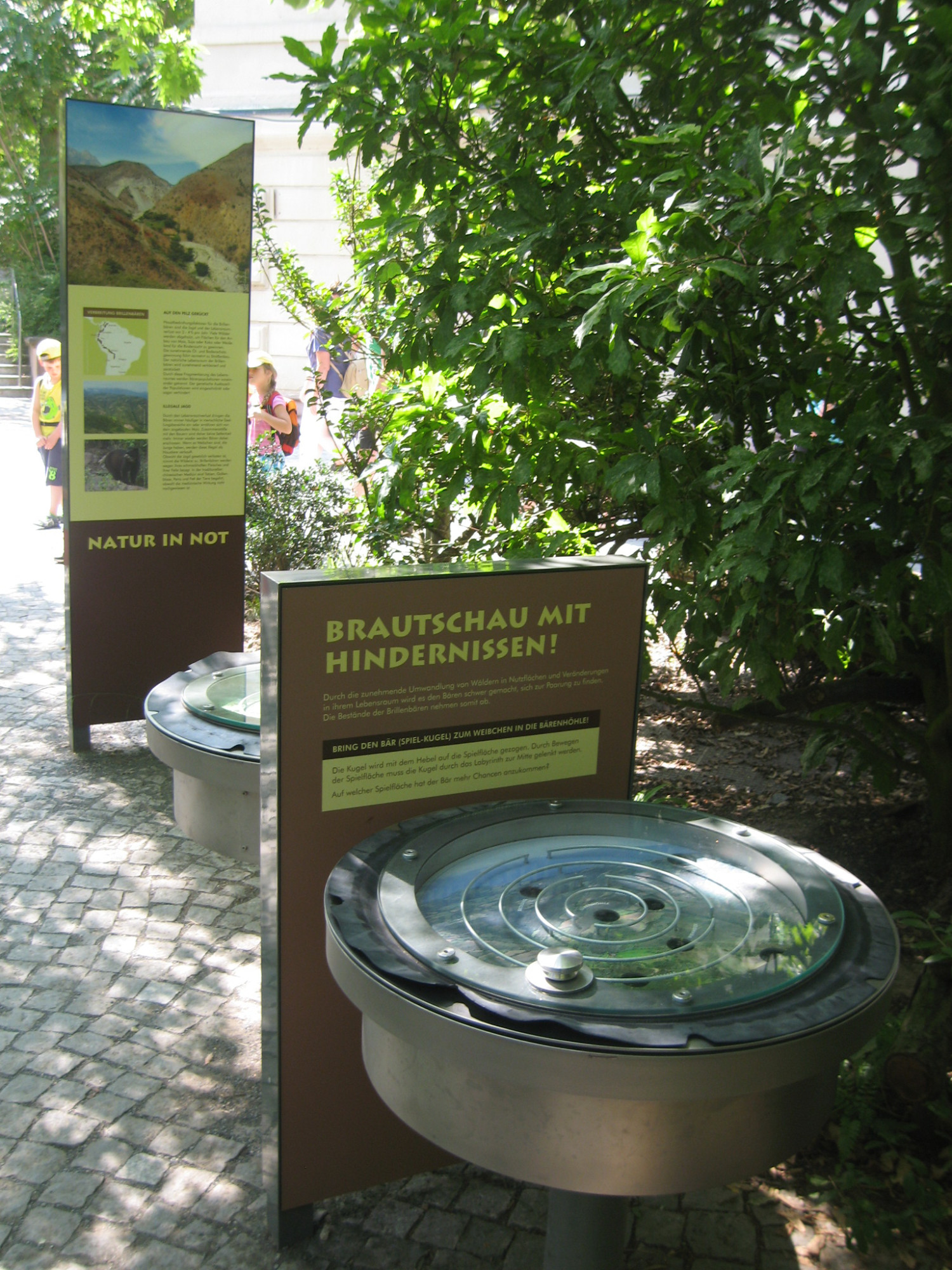 Die interaktiven Elemente sind stark beansprucht, einerseits durch die Besucher:innen, andererseits durch die Witterung. Das erfordert besondere Aufmerksamkeit. Die Mechanismen der Interaktionen sind robust und aus entsprechenden Materialien konzipiert. Um die Text-Bild-Tafeln langfristig vor Bewitterung und mechanischer Beanspruchung zu schützen, werden spezielle Herstellungsverfahren eingesetzt.