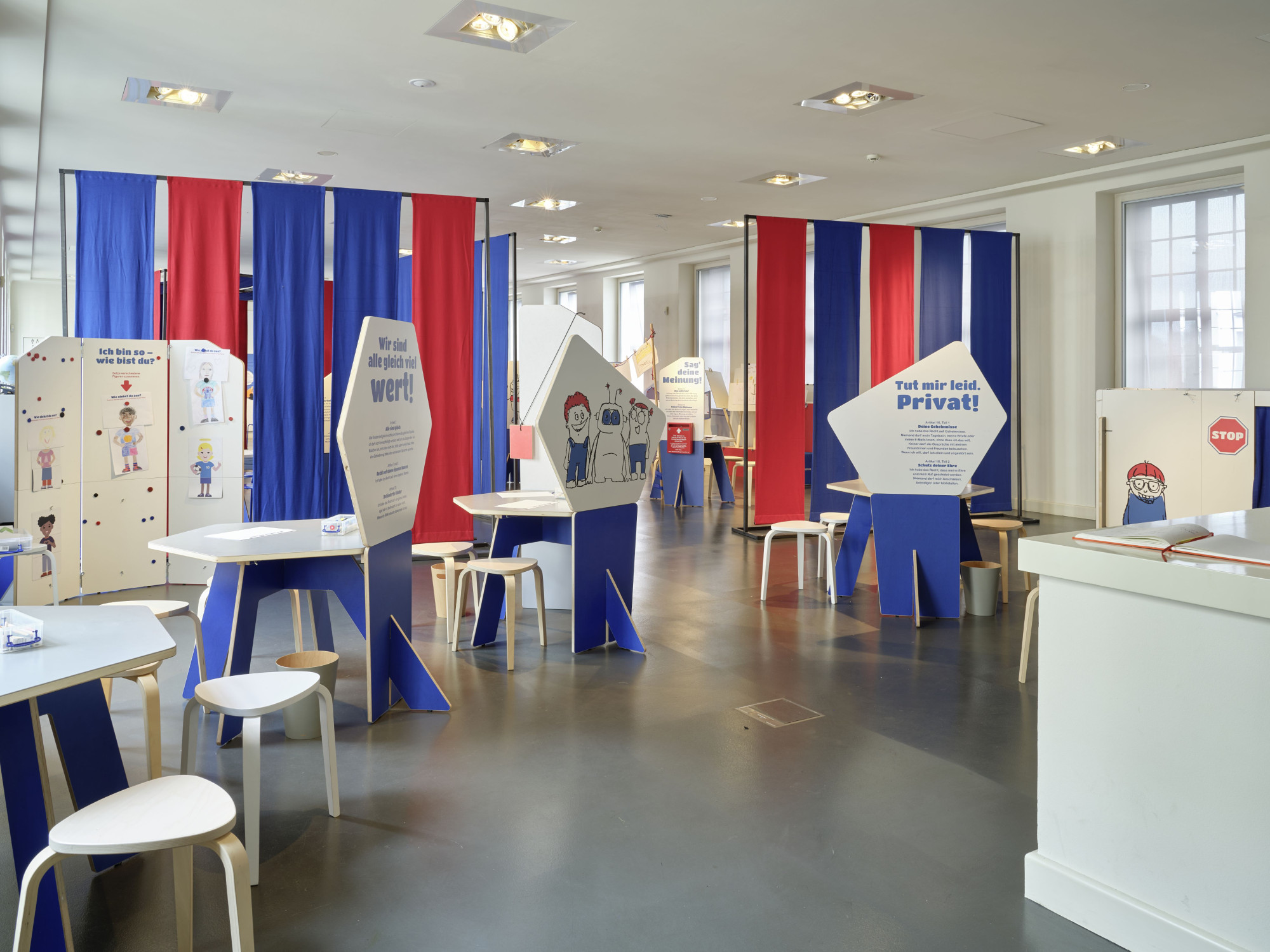 Die interaktive Ausstellung zu den Kinderrechten wurde im Auftrag des Kinderbüros zunächst als Wanderausstellung konzipiert und gestaltet. Die Stationen bestehen aus mobilen Elementen, die sich innerhalb eines halben Tages auf- oder abbauen lassen. Für eine Präsentation im Jungen Museum wurde die Ausstellung um ein Forum sowie durch weitere Stationen erweitert. Um die Raumakustik zu verbessern und die inhaltlichen Stationen zu struktieren, wurden Raumtrenner mit Textilbahnen eingebracht.