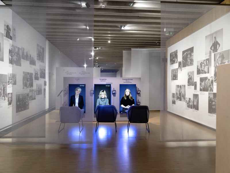 Für die Präsentation von rund 450 Exponaten wurde eine Architektur entwickelt, die sowohl kabinettartige Räume als auch lange Blickachsen nutzt, um eine abwechslungsreiche Dramaturgie zu schaffen. Diese Struktur unterstützt die chronologisch angeordneten Themenschwerpunkte und den vielfältigen Exponatbestand. Das Farbkonzept orientiert sich am Graukeil aus der Schwarz-Weiß-Fotografie und hilft dabei, die verschiedenen Bereiche visuell zu gliedern.
