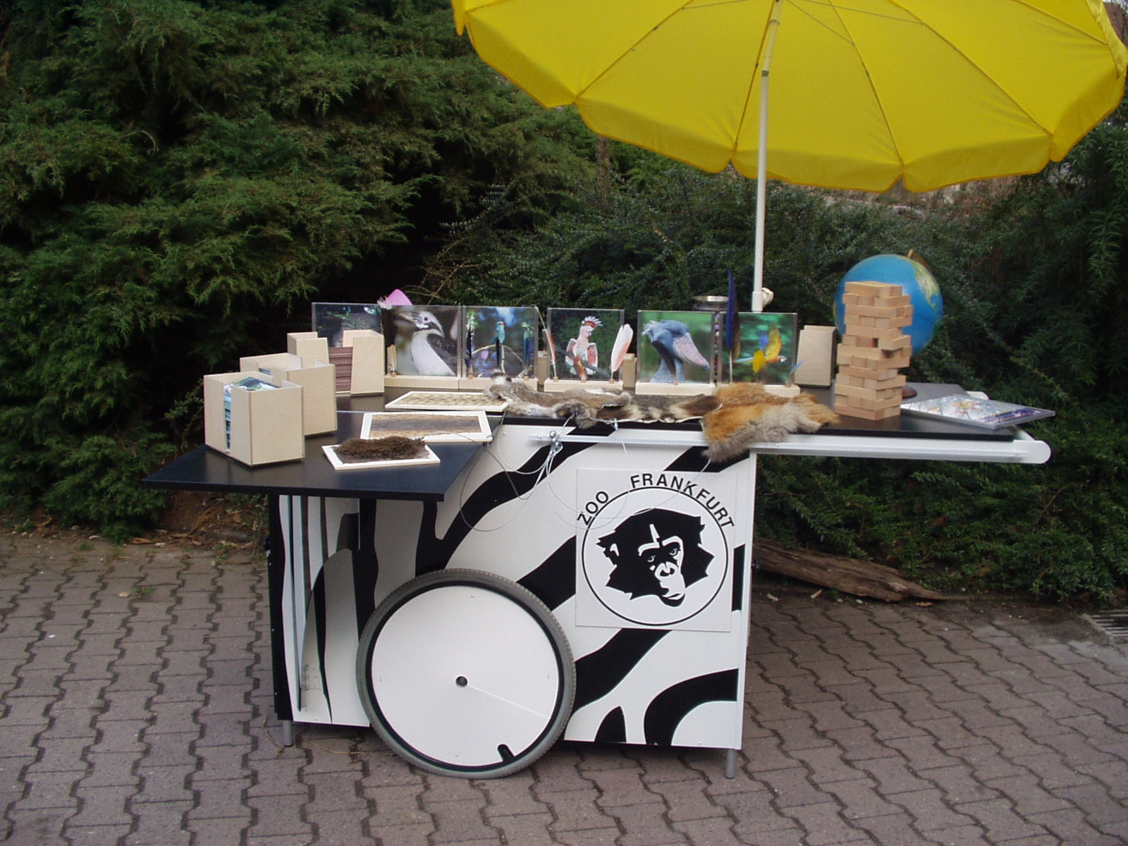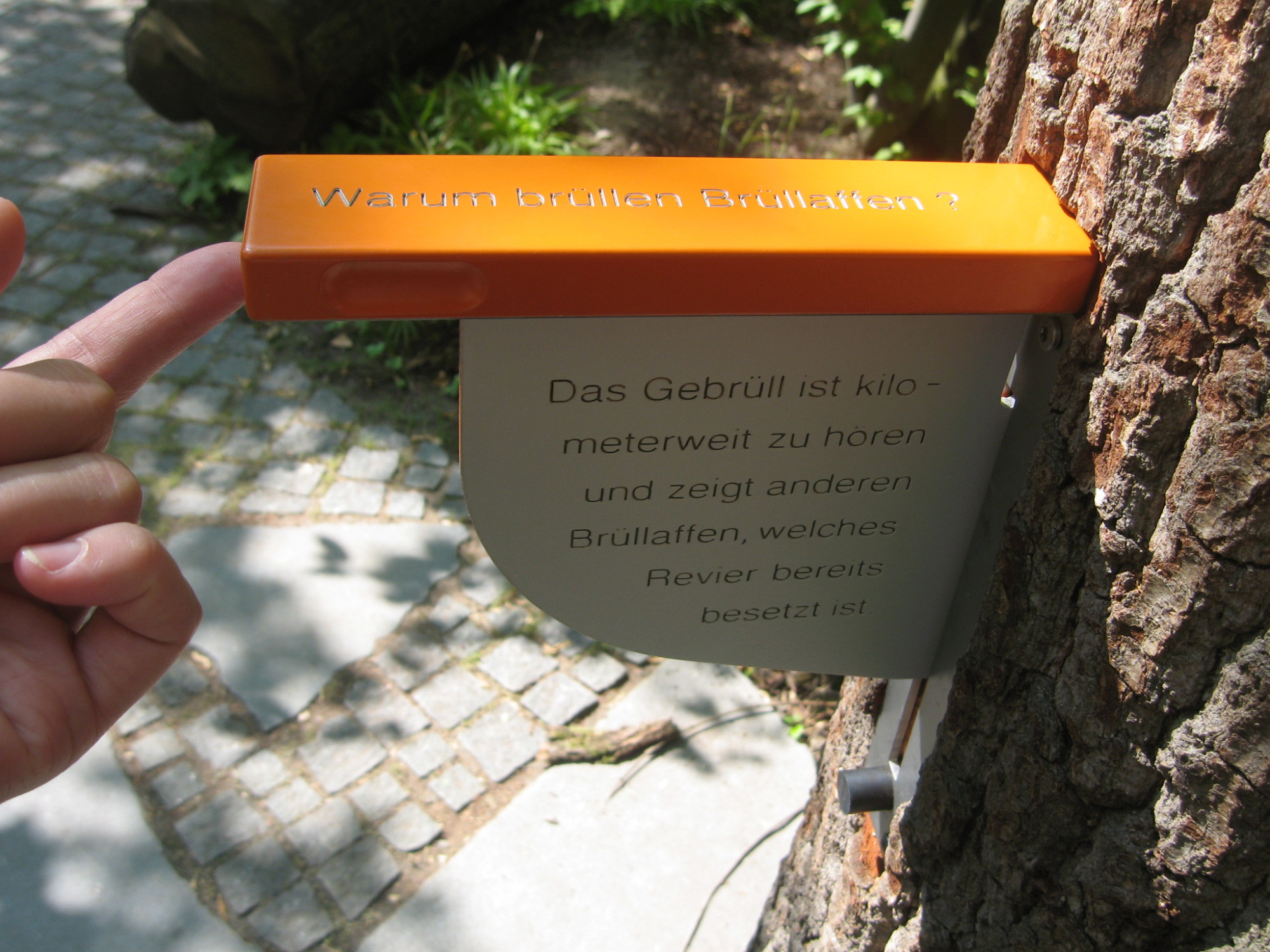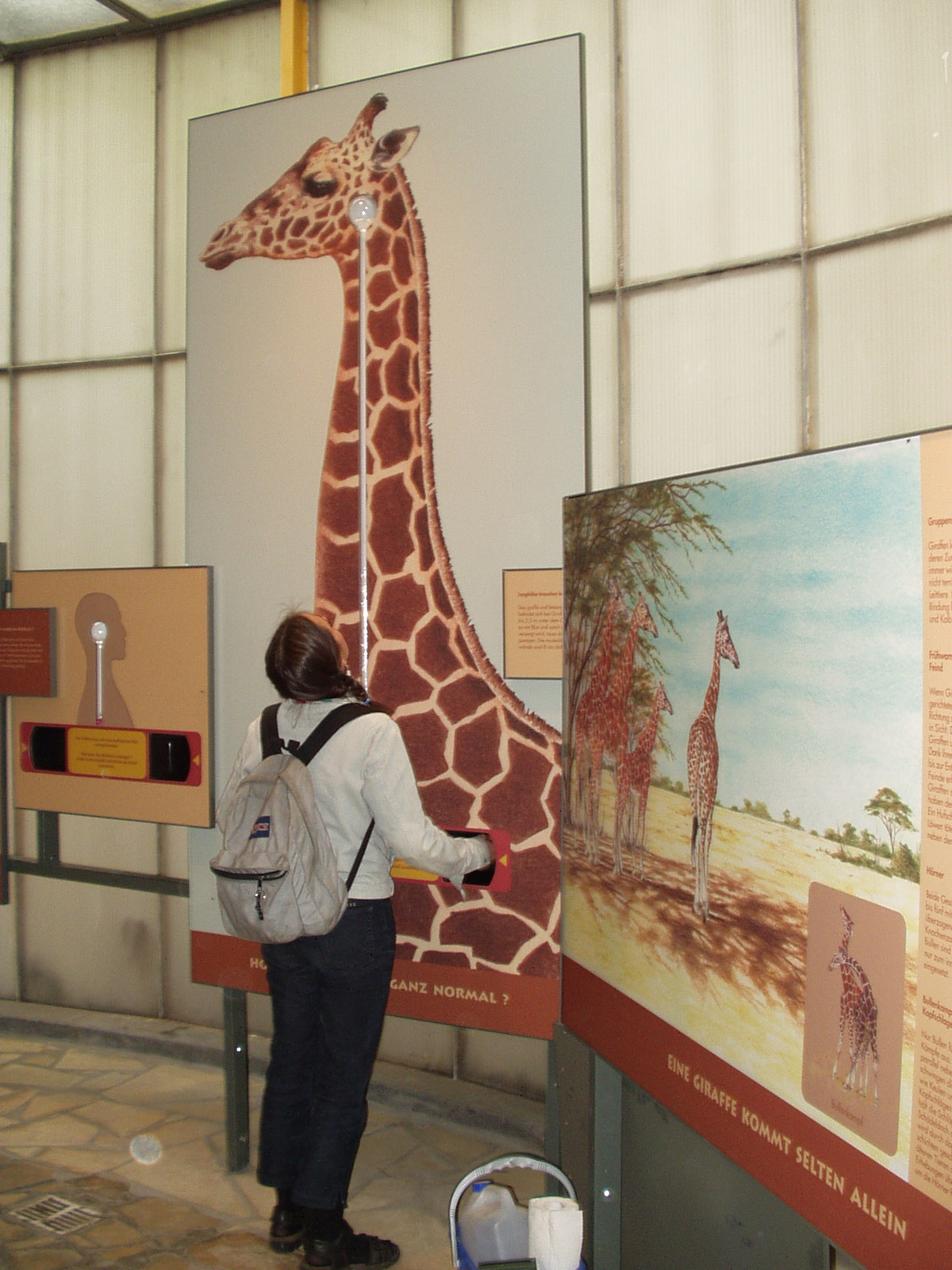 Seit dem Jahr 2000 haben wir gemeinsam mit der Zoopädagogin ein Informationssystem für den Zoo Frankfurt entwickelt. Es umfasst Tafeln, die über den Körperbau, das Verhalten und die Lebensräume der Tiere sowie über Naturschutzthemen informieren. Die Tafeln werden mit interaktiven Objekten kombiniert, die komplexe Zusammenhänge auf spielerische Weise veranschaulichen. Die Besucher:innen können konkrete sinnliche Erfahrungen sammeln und anhand kleiner eigener Experimente Antworten auf gestellte Fragen finden.